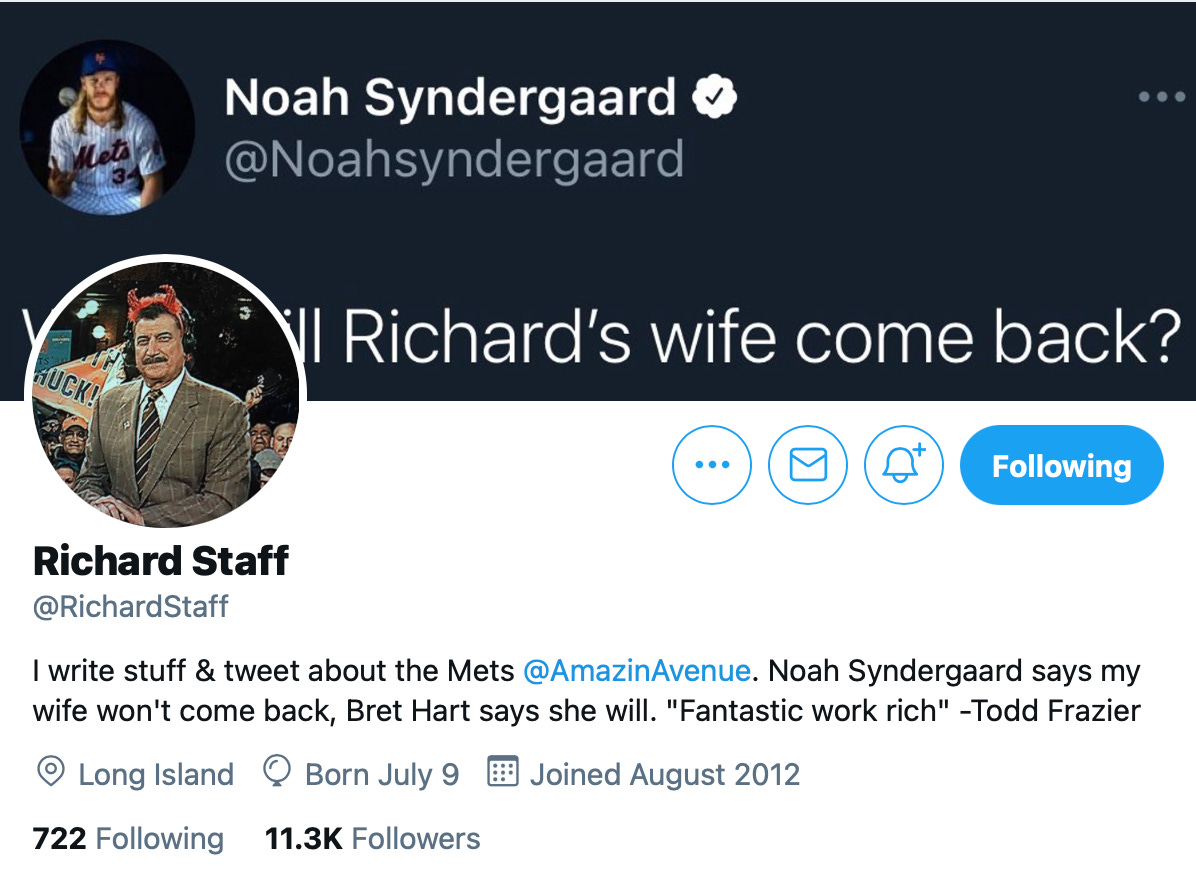 Richard Staff is not a 47-year-old divorced man: he is 22, and he’s never even been married. He is a writer for the Mets blog “Amazin’ Avenue.” When Spring Training began in 2020, he had around 1000 twitter followers; by the end of the 2020 season, that number had doubled to about 2,000. He now has 11,300 followers, and that number is growing every day. Several of his tweets have garnered over 20,000 likes. He regularly interacts with national baseball writers, among whom his tweets have taken on a life of their own. And yes: he is regularly bullied by Noah Syndergaard over a completely fictional Twitter backstory.